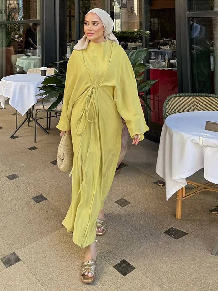 Este vestido largo presenta una cintura plisada y un cuello redondo con cordones, lo que ofrece un aspecto sofisticado y elegante para cualquier ocasión.