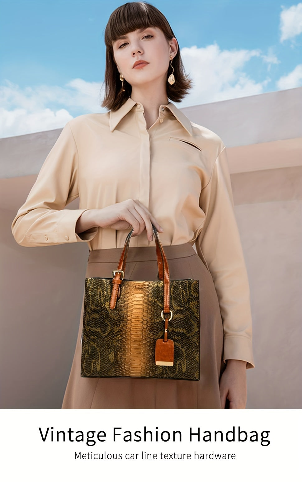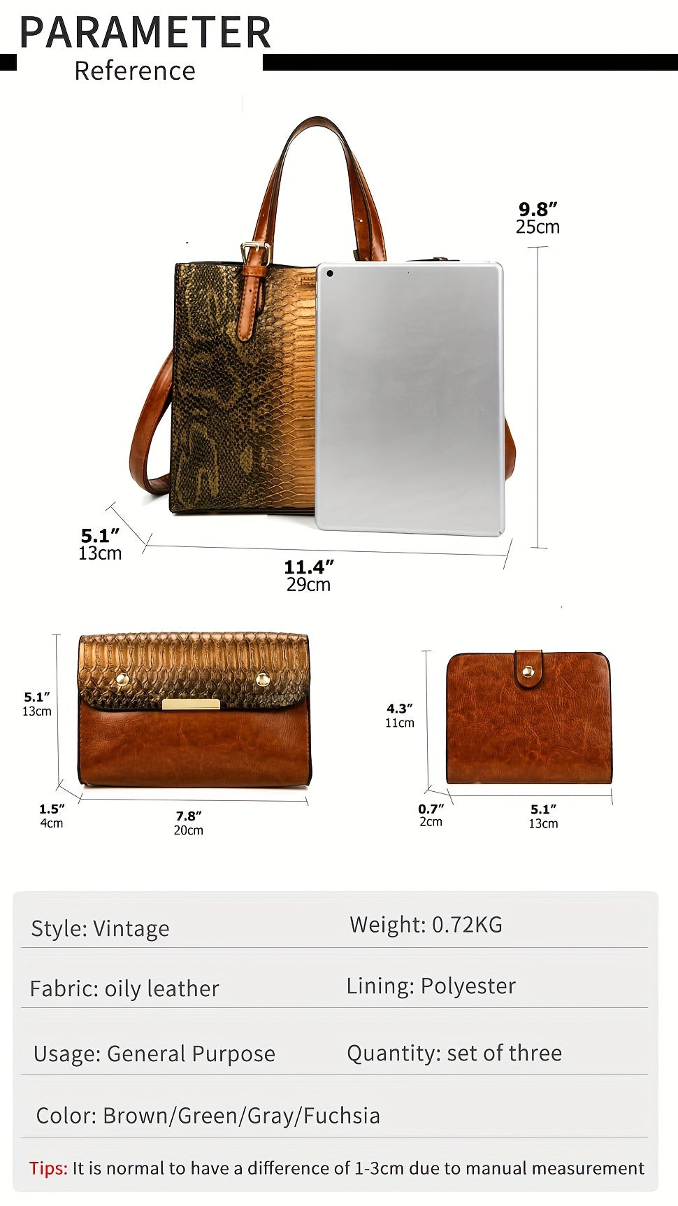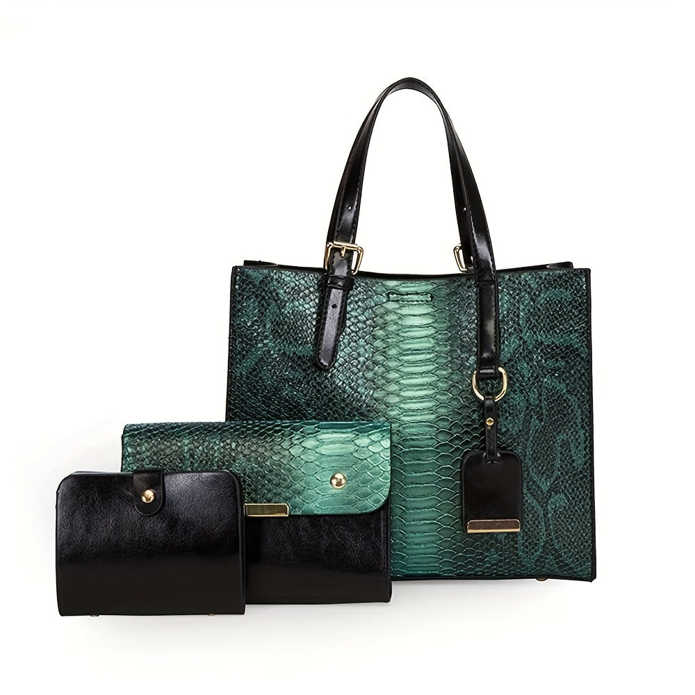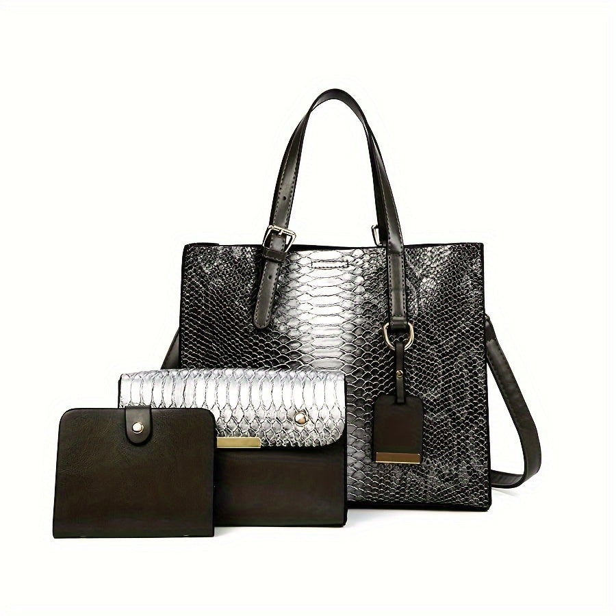 Experience unmatched exclusivity with the Stylish 3-Piece Set - Faux Leather Crocodile Pattern Handbags - Vintage Design Tote With Matching Clutch & Wallet Crossbody Bag. This carefully curated collection is designed for those who appreciate the perfect blend of timeless elegance and modern sophistication.