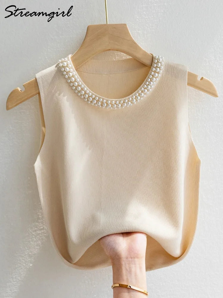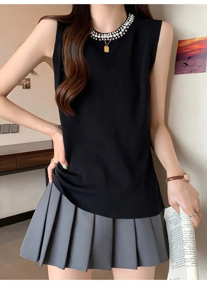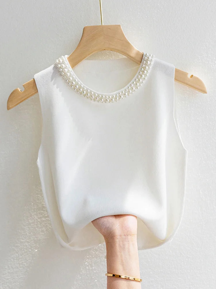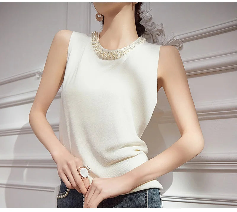 Mejora tu armario de verano con la elegante blusa blanca sin mangas lisa de punto con cuentas para mujer, ideal para oficina, cuello redondo y cuello redondo. Esta elegante prenda combina sofisticación y comodidad, ideal para mujeres profesionales que buscan un look elegante durante el verano. Su elegante diseño y sus exclusivos detalles de cuentas la convierten en una prenda destacada para cualquier atuendo de oficina o informal de verano.