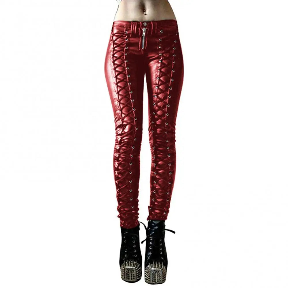 Elevate your everyday look with these exclusive Women Pants Steampunk Women Faux Leather Ruffle Pants Carnival Party Skinny Button Trousers—a distinctive garment that promises both allure and prestige.