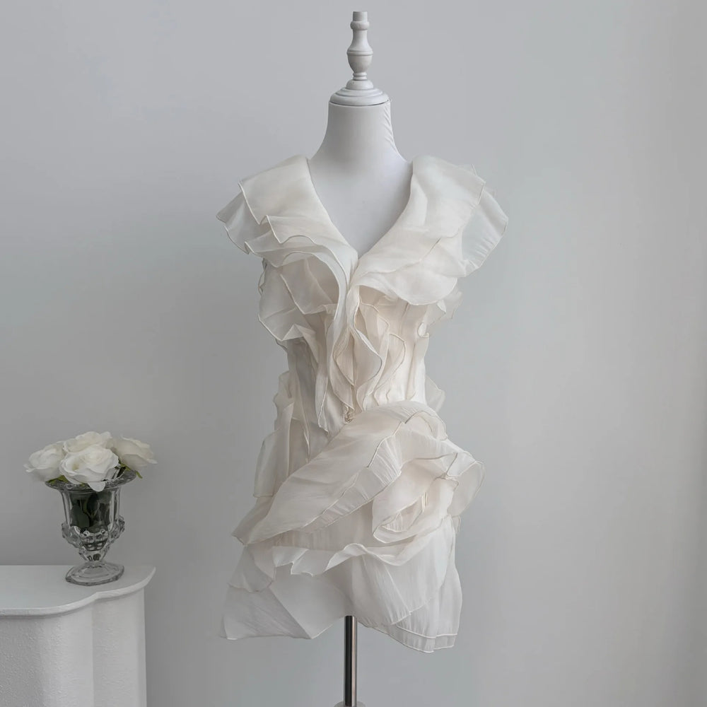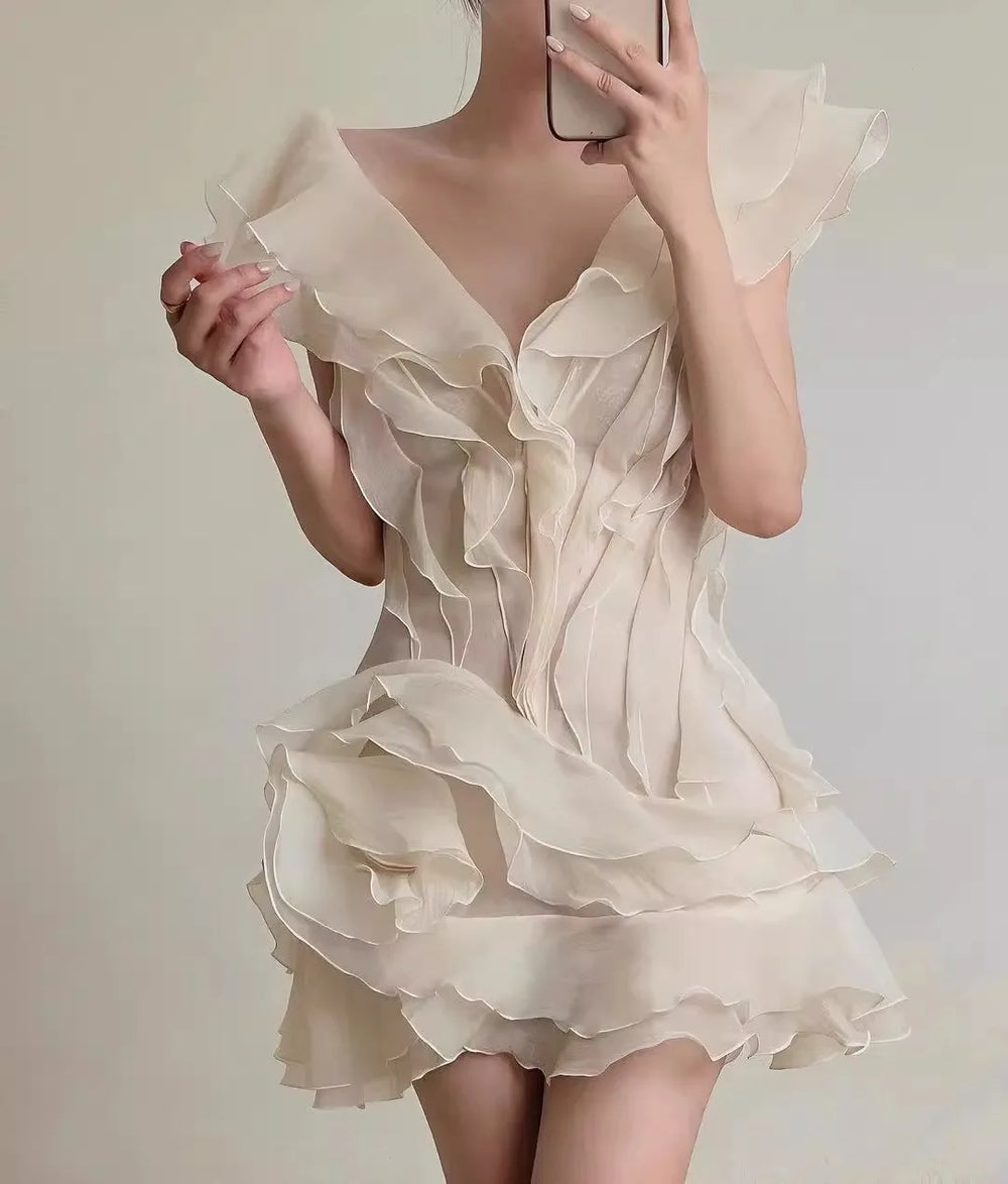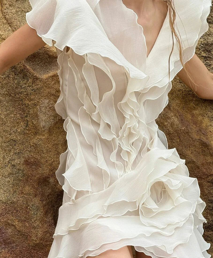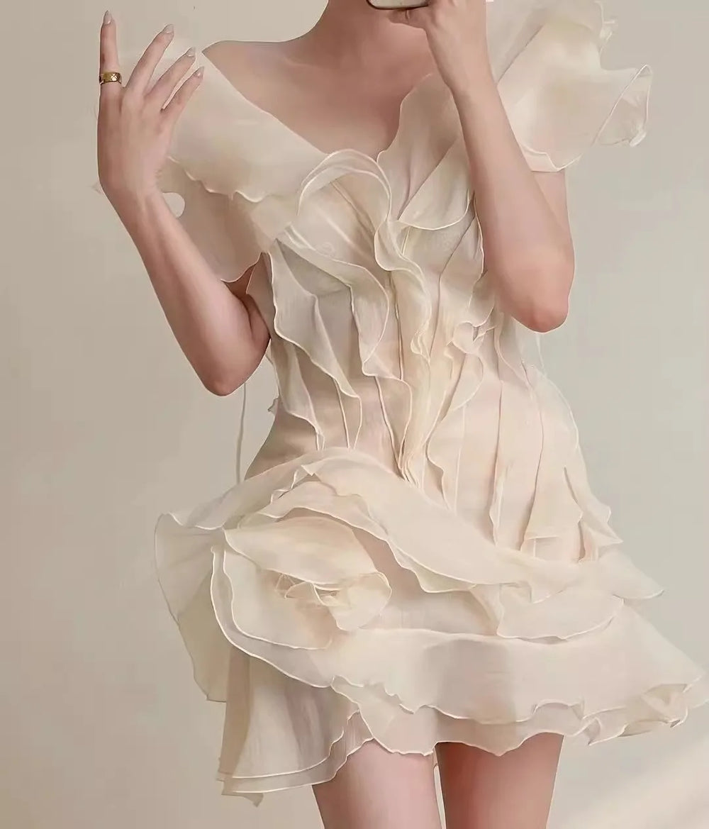 Elevate your wardrobe with the 2025 New Ruffle Dress Niche Design Flowers Gentle Sweet Short Skirt Irregular About, and embrace the beauty and freshness of spring wherever you go.