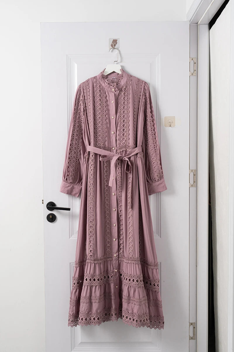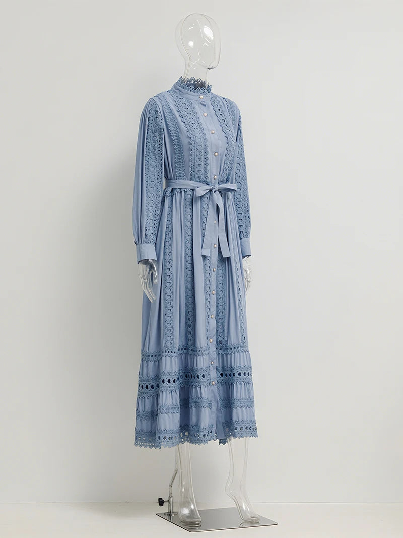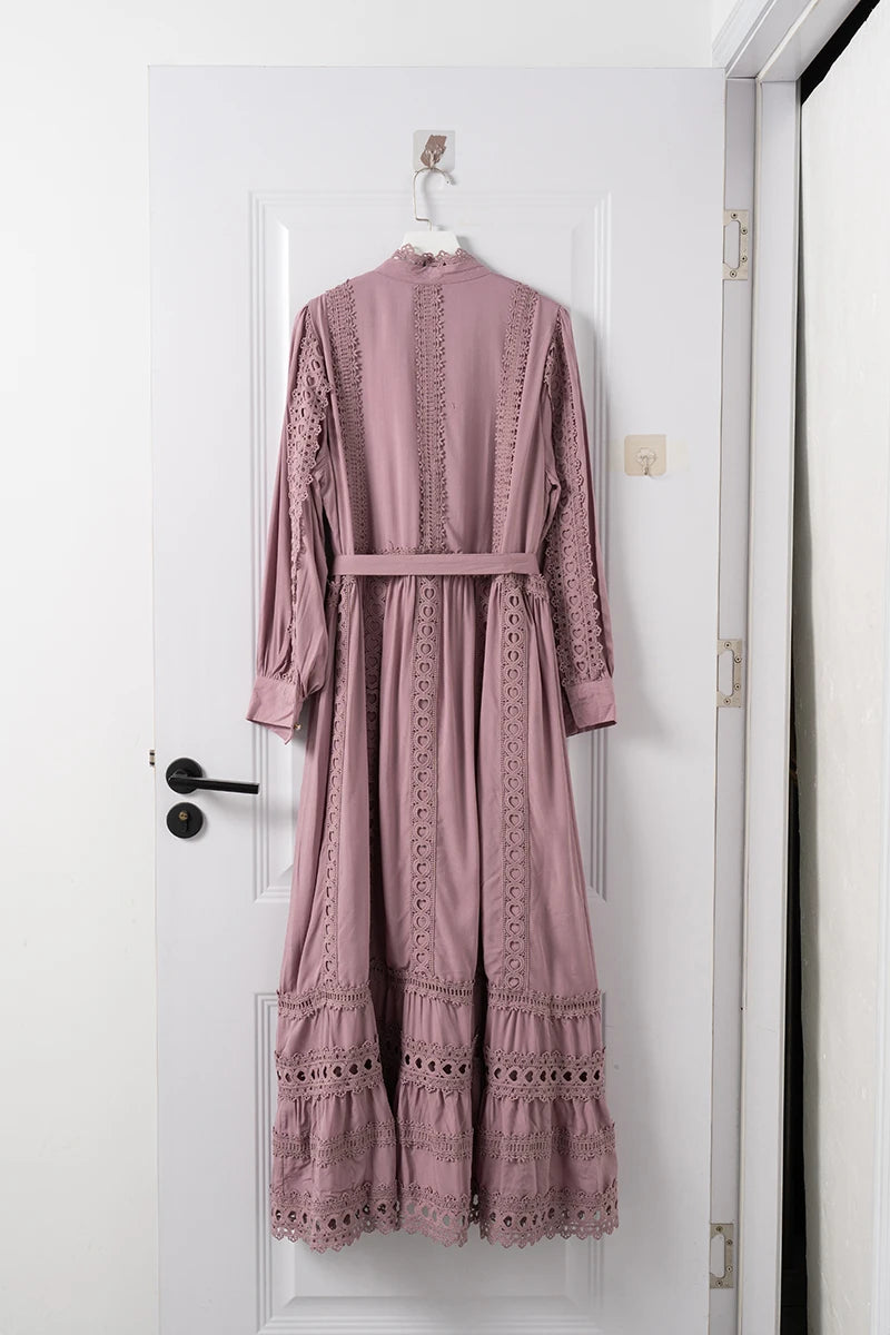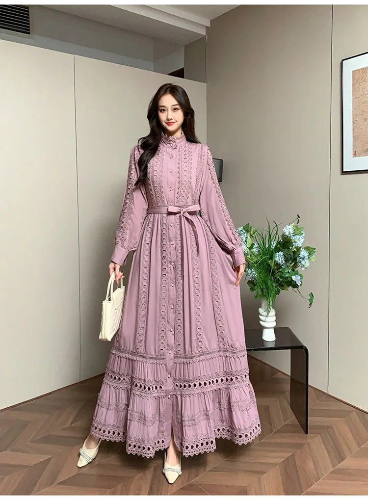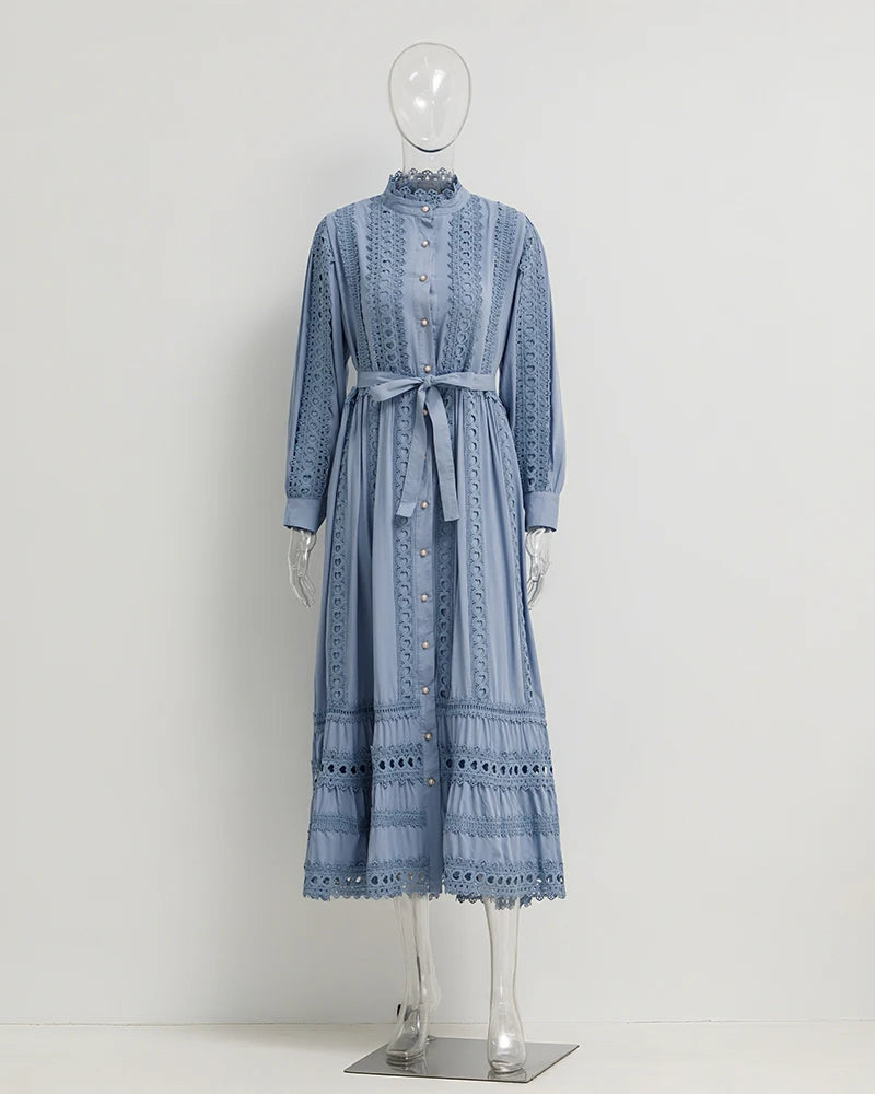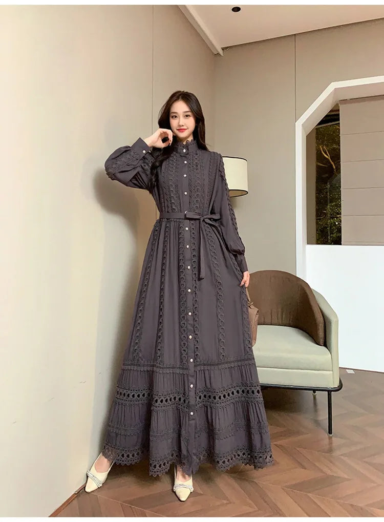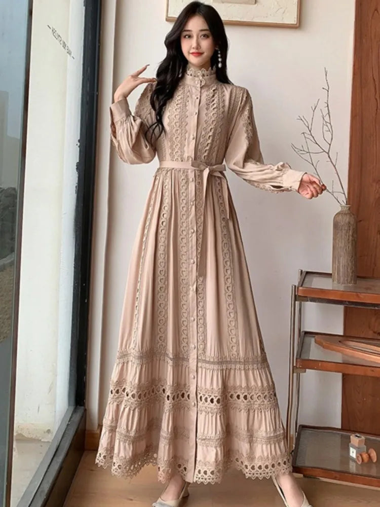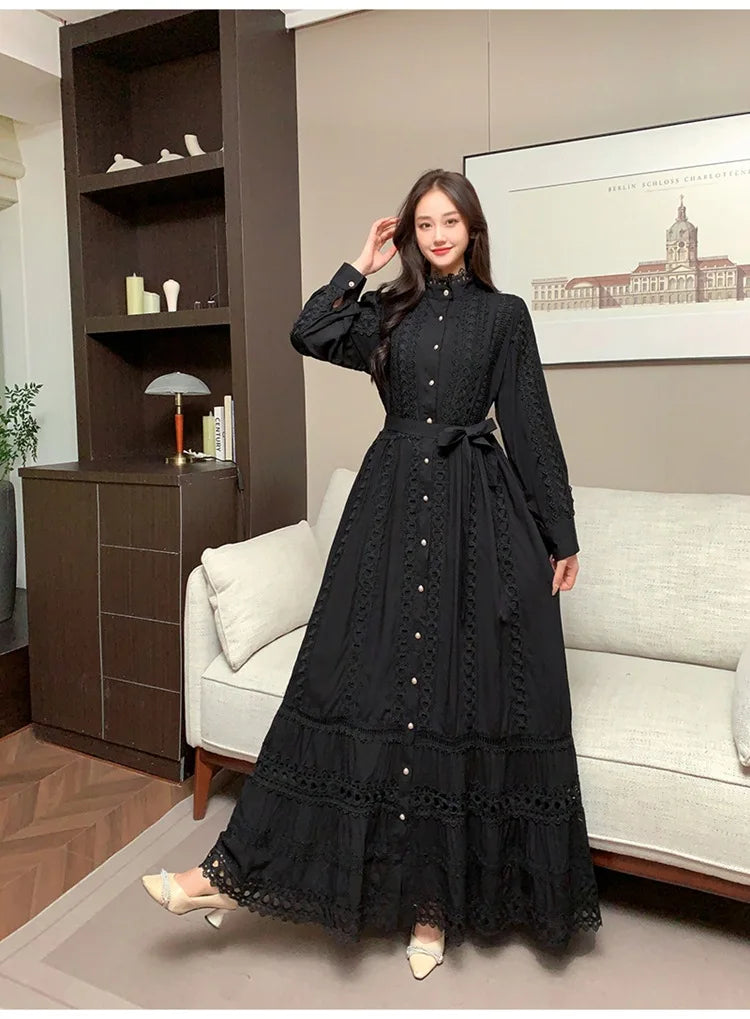 This 2025 new women's dress boho retro hollow lace splicing spring and autumn dress belt waist long sleeve lapel long dress is available in limited quantities, ensuring that each piece remains a rare and coveted addition to your collection.
