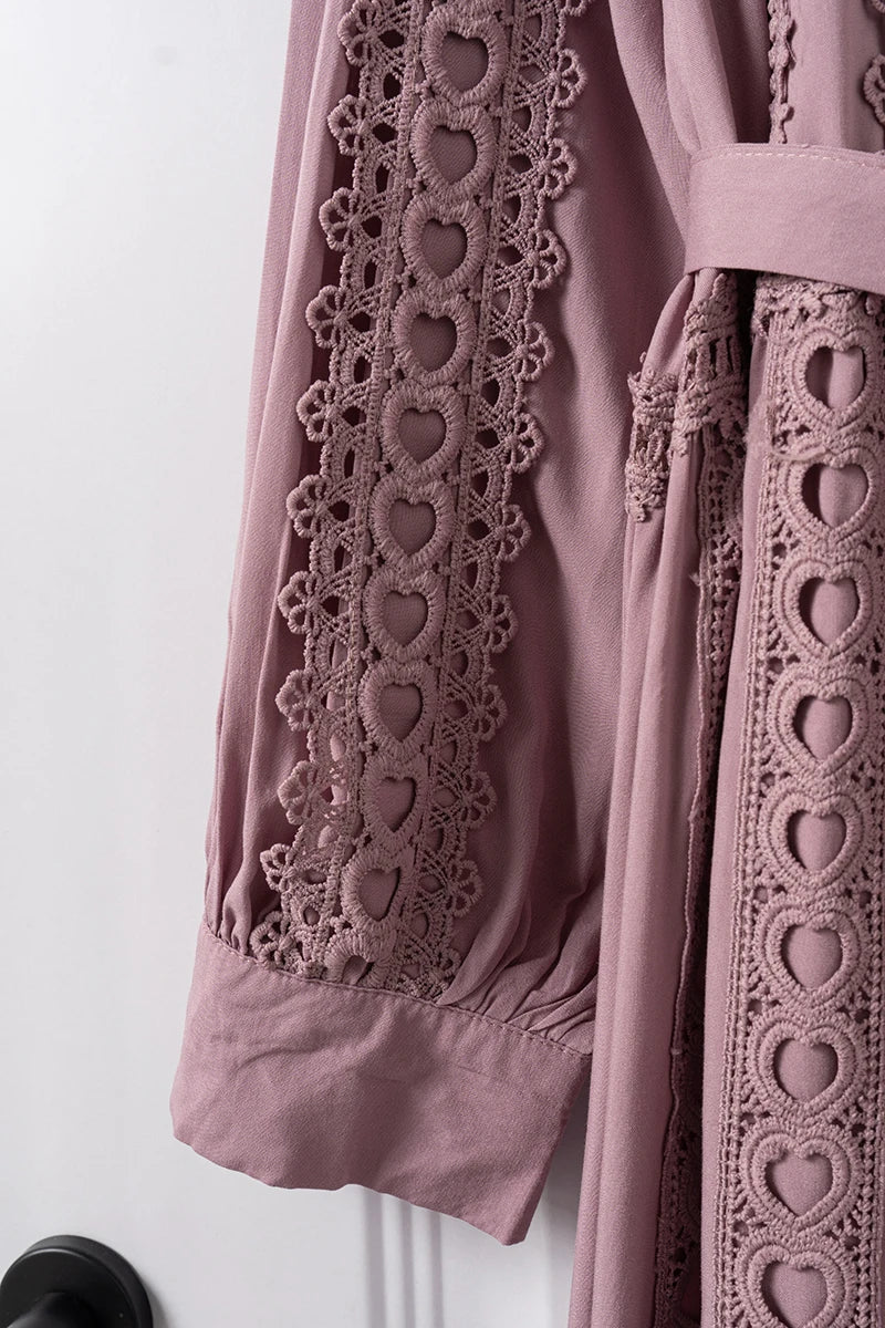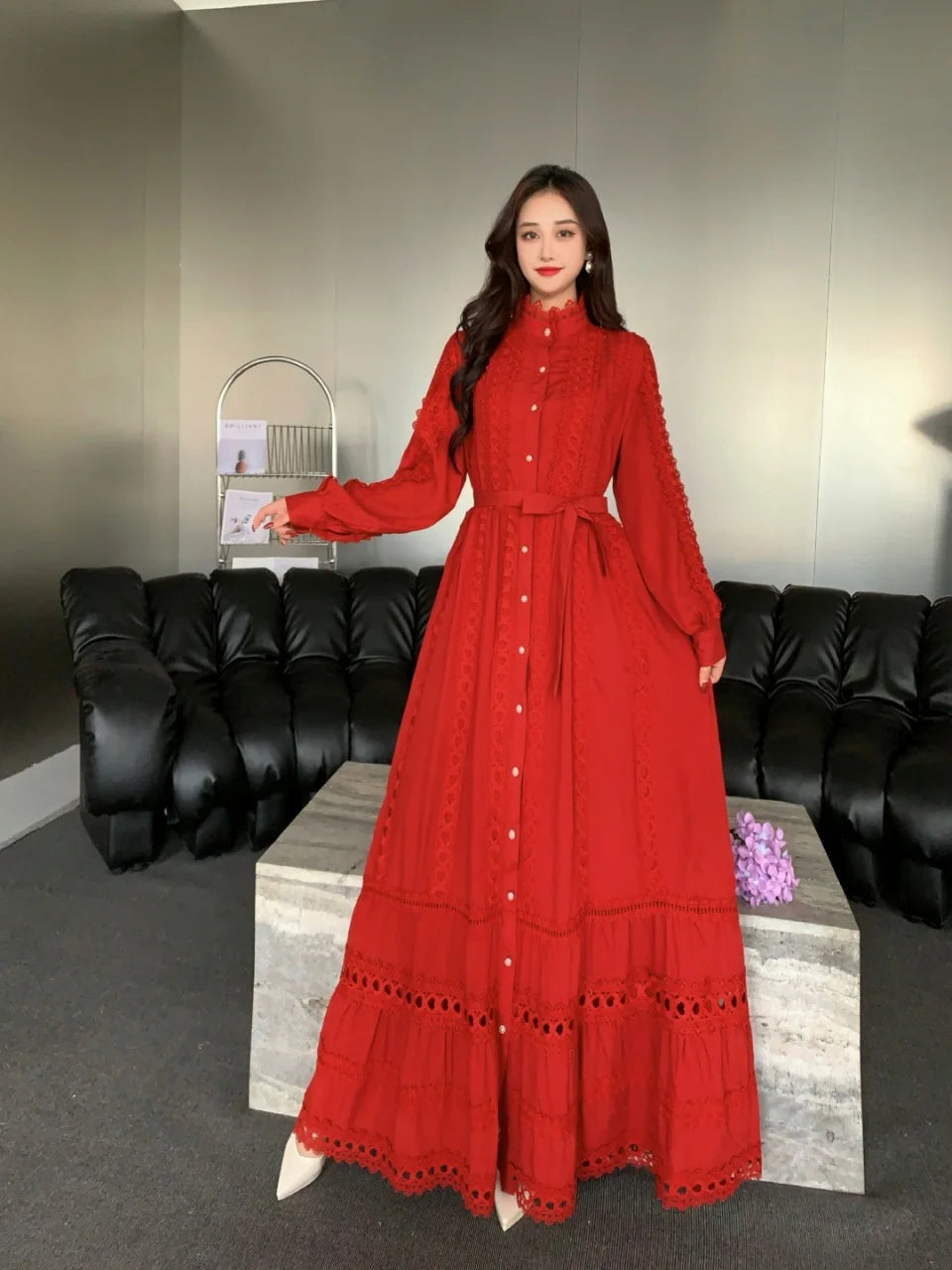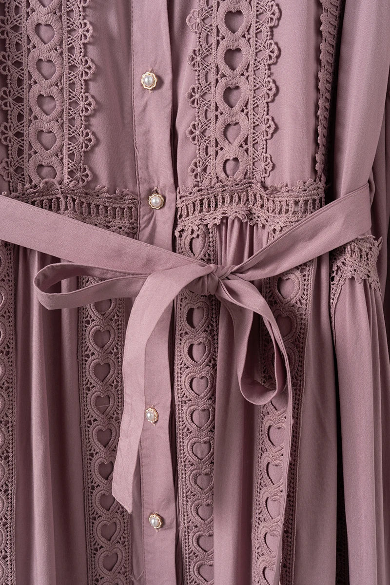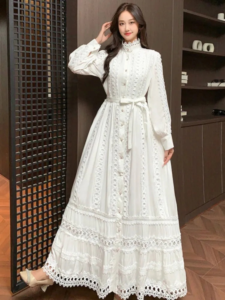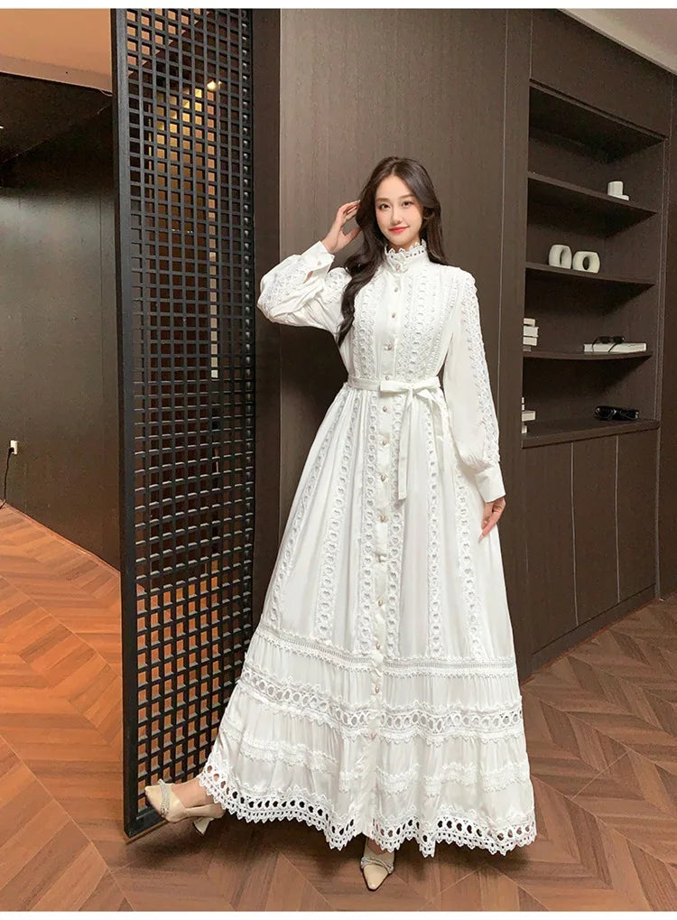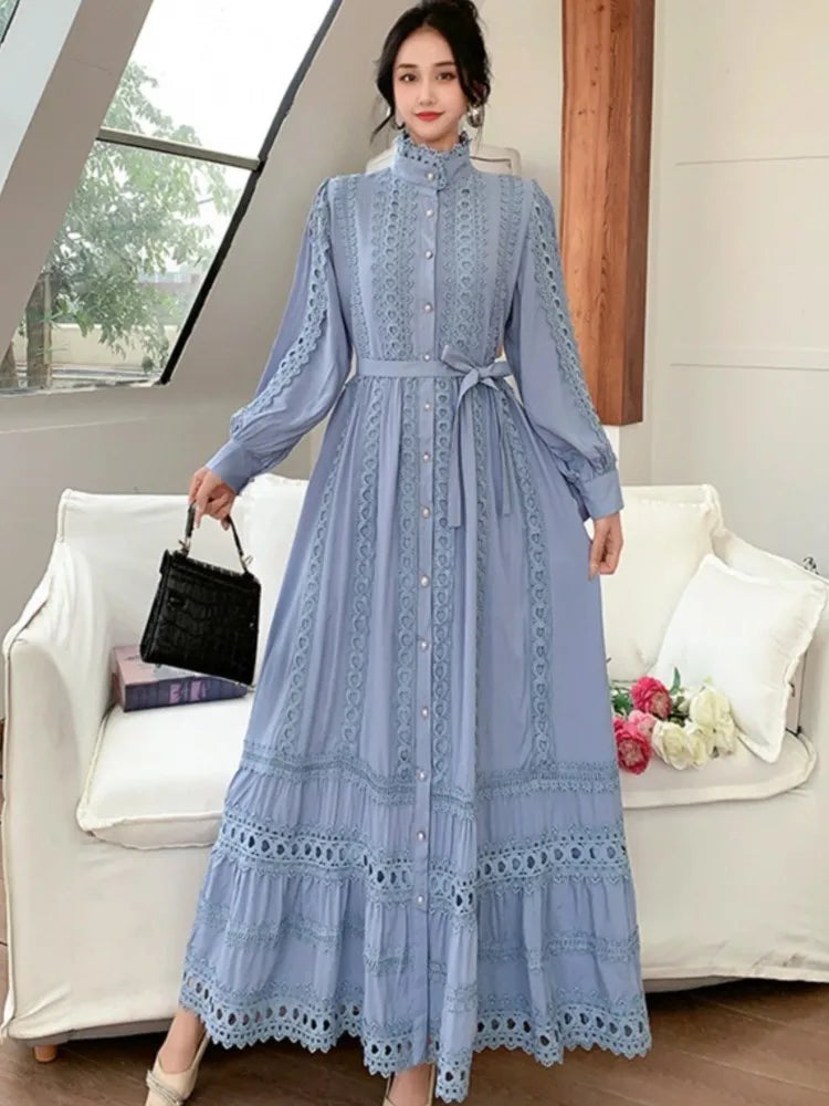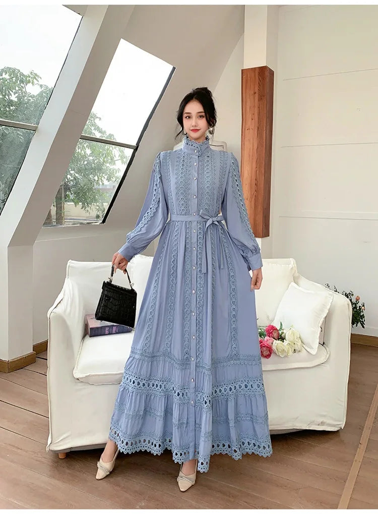 This 2025 new women's dress boho retro hollow lace splicing spring and autumn dress belt waist long sleeve lapel long dress is available in limited quantities, ensuring that each piece remains a rare and coveted addition to your collection.
