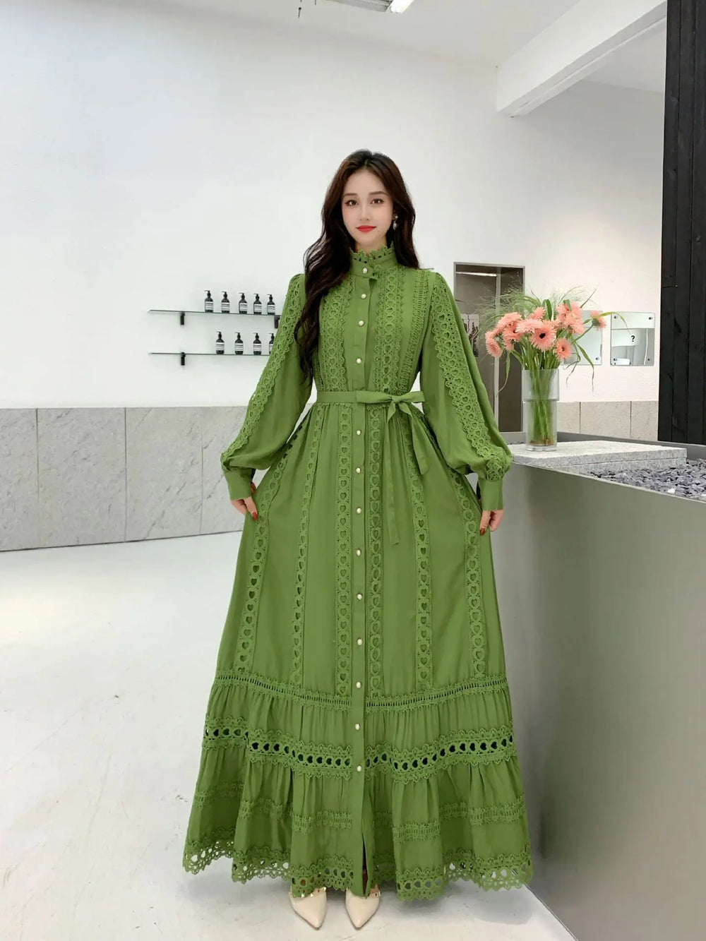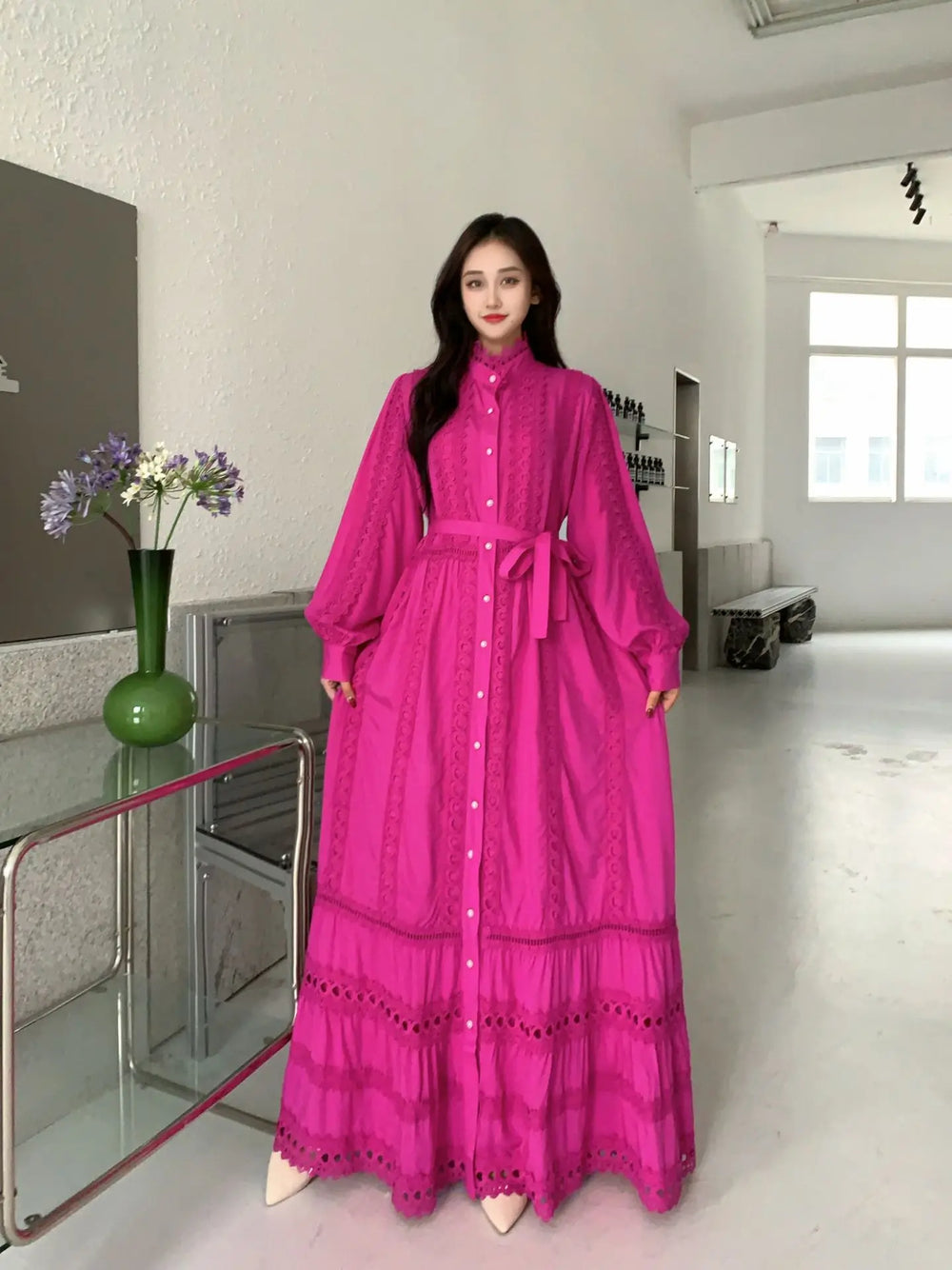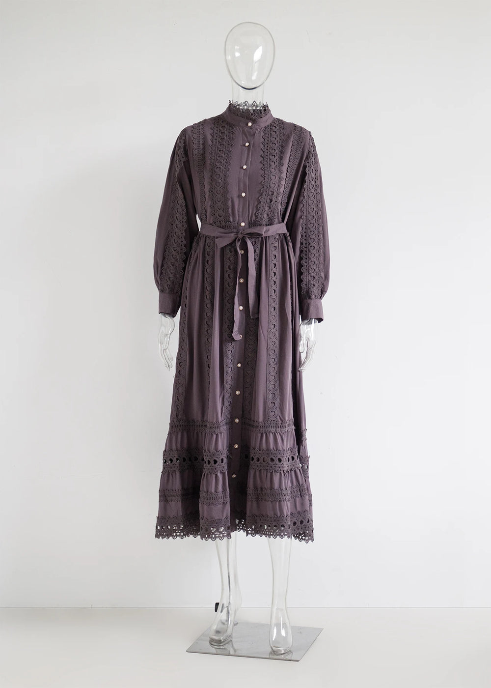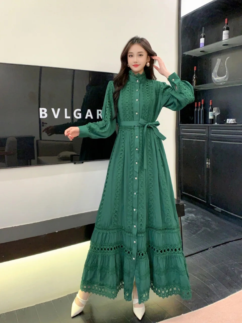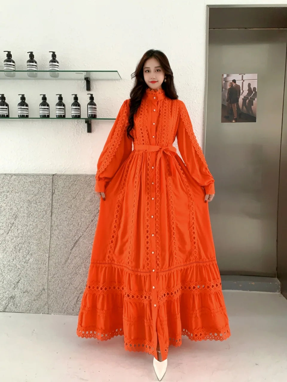 This 2025 new women's dress boho retro hollow lace splicing spring and autumn dress belt waist long sleeve lapel long dress is available in limited quantities, ensuring that each piece remains a rare and coveted addition to your collection.