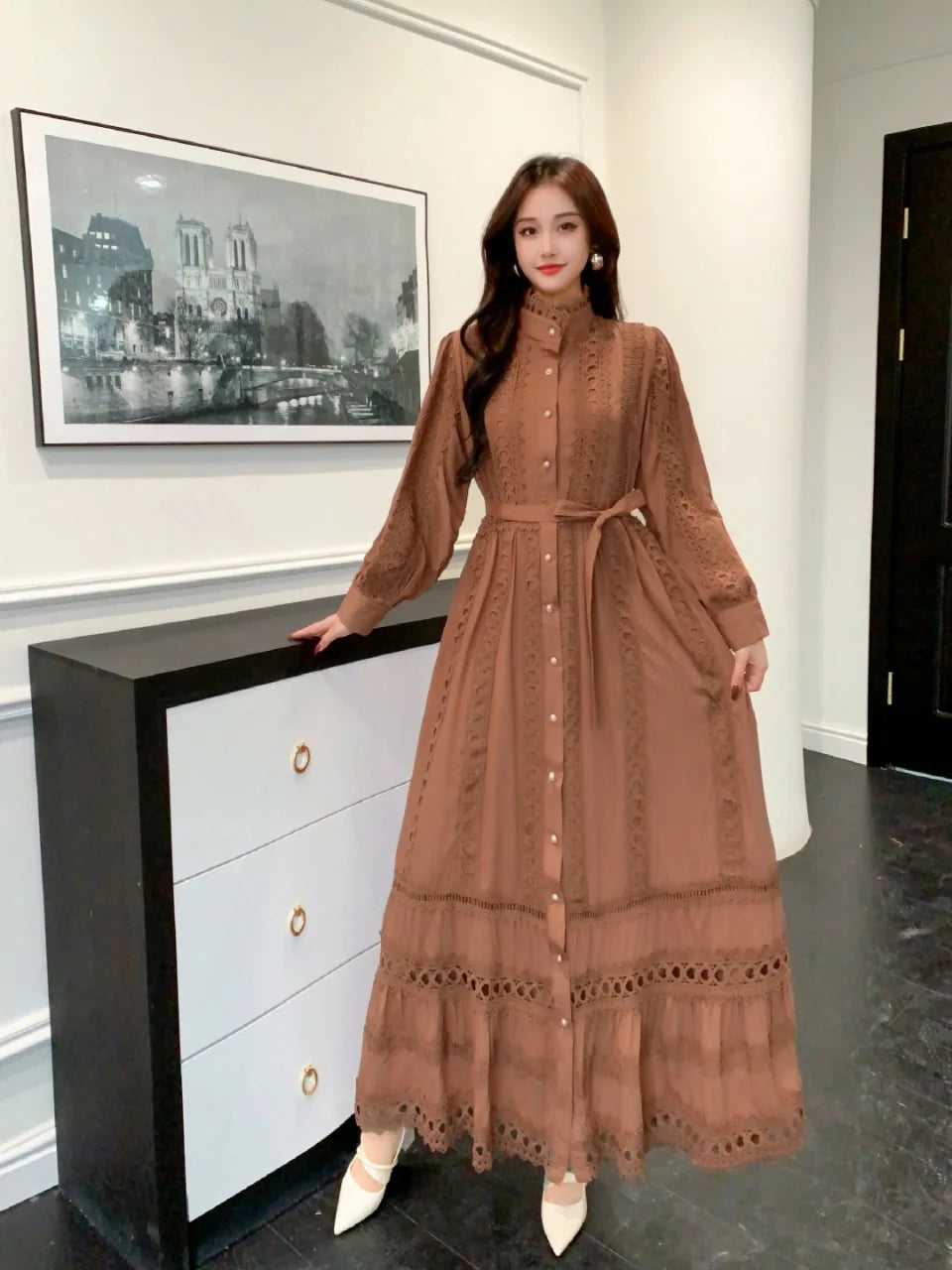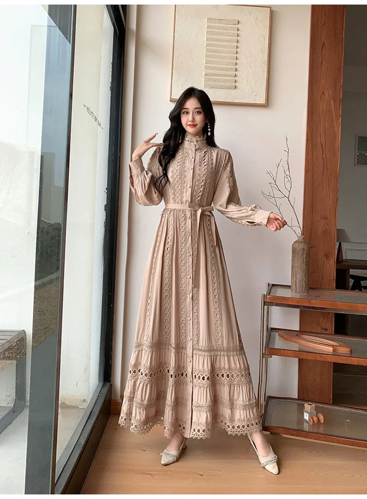 Experience unparalleled elegance with this exclusive spring and autumn long dress, designed for women who value both style and sophistication. This 2025 new women's dress boho retro hollow lace splicing spring and autumn dress belt waist long sleeve lapel long dress showcases a unique blend of vintage charm and modern design, making it a standout piece in any wardrobe.