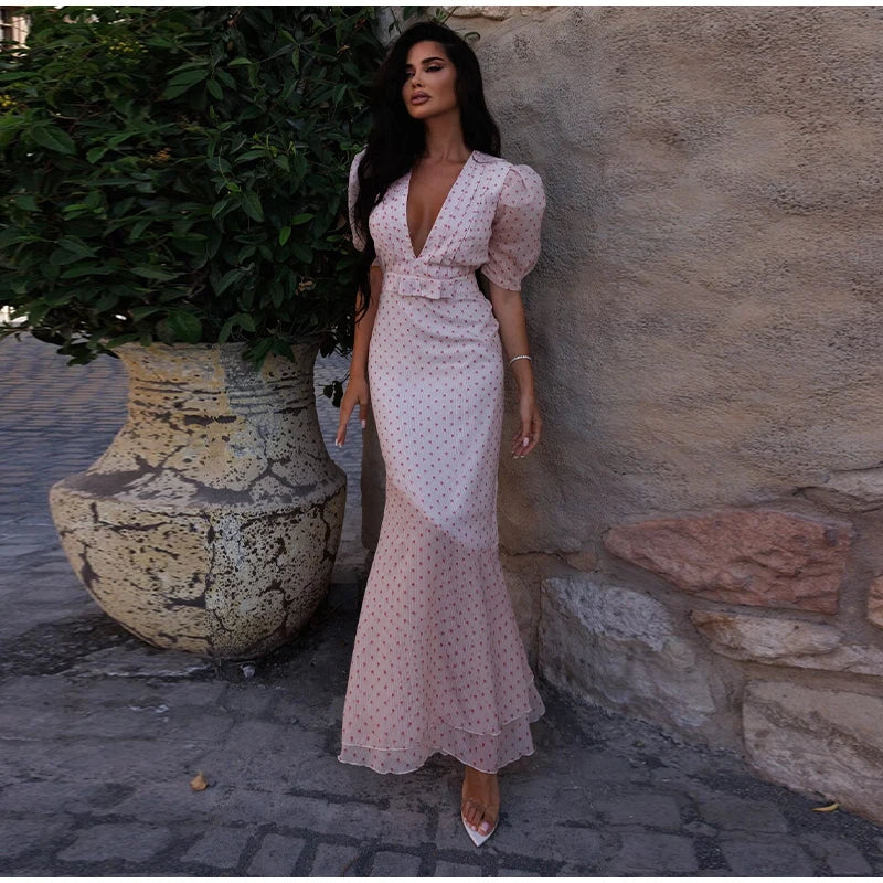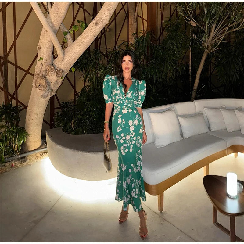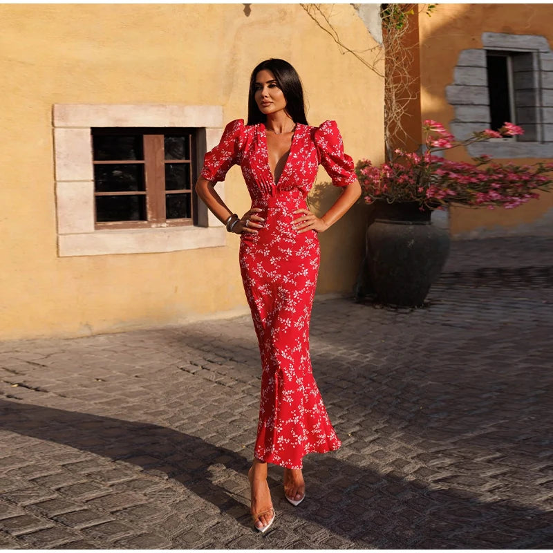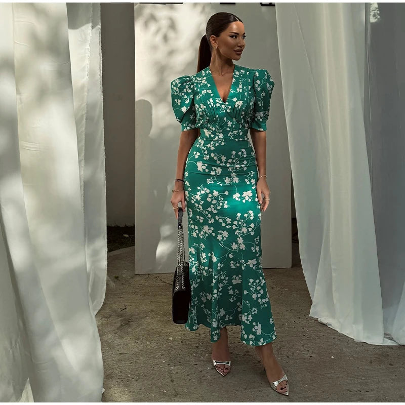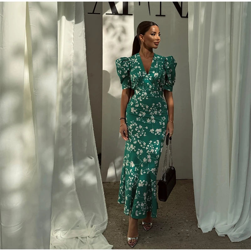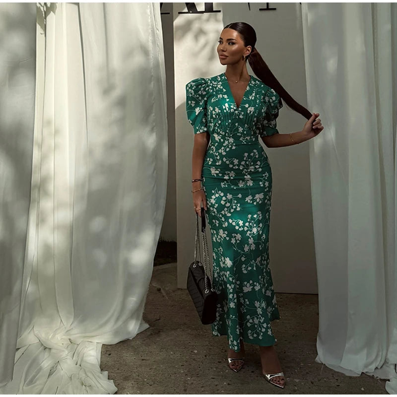 This Printed Puff Sleeve Sexy Deep V-neck Dress High Waist Holiday Patchwork Chic High Waist Summer Dresses Party Lady Fishtail Robe is available in limited quantities, making it a special edition piece for your wardrobe. Don’t miss the opportunity to own a unique dress designed to turn heads and celebrate your style.