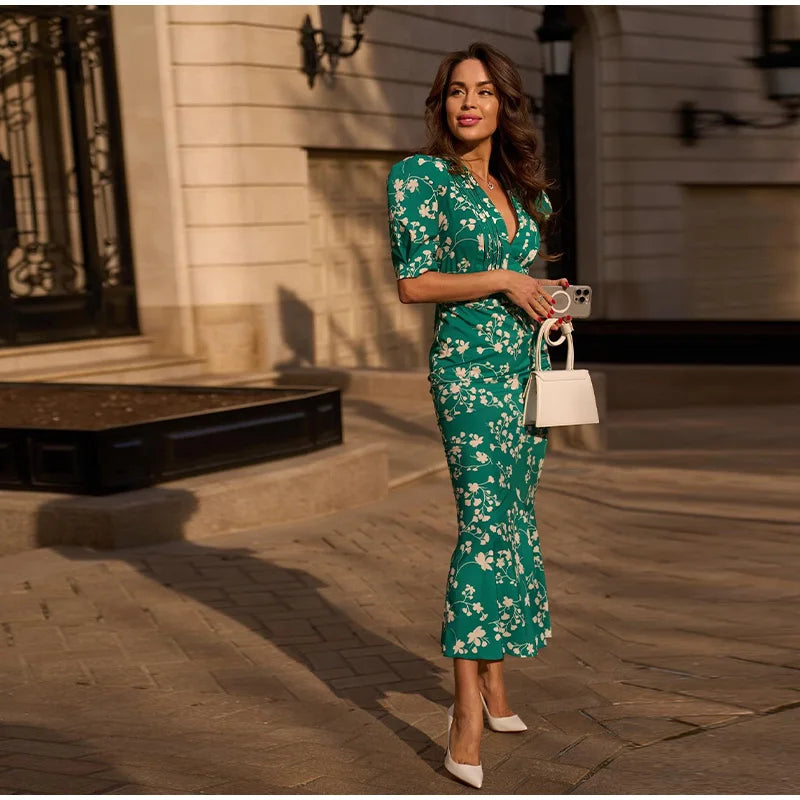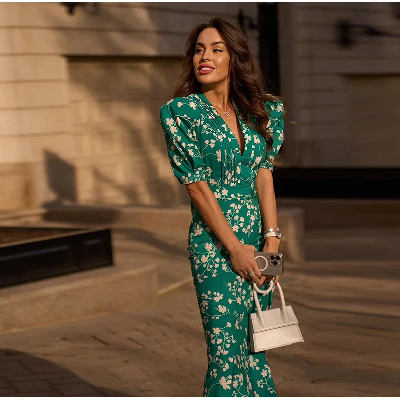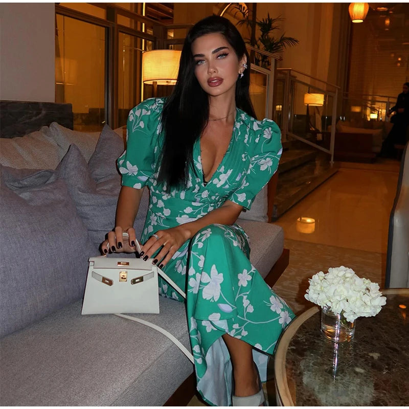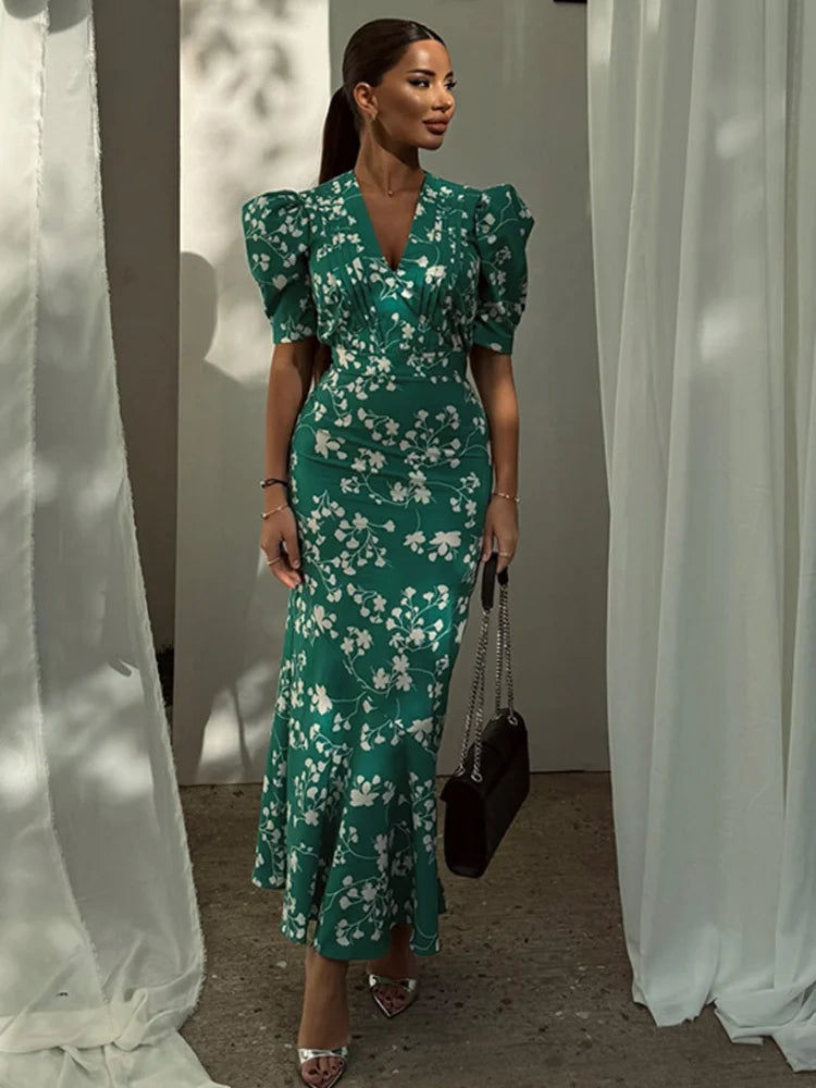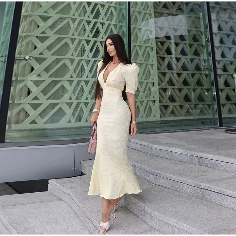 This Printed Puff Sleeve Sexy Deep V-neck Dress High Waist Holiday Patchwork Chic High Waist Summer Dresses Party Lady Fishtail Robe is available in limited quantities, making it a special edition piece for your wardrobe. Don’t miss the opportunity to own a unique dress designed to turn heads and celebrate your style.