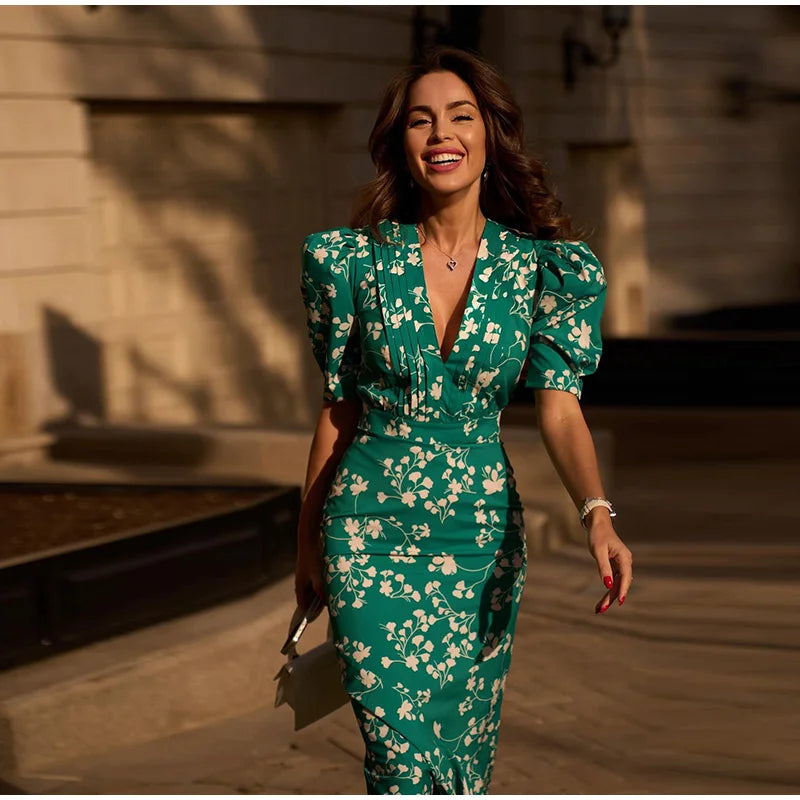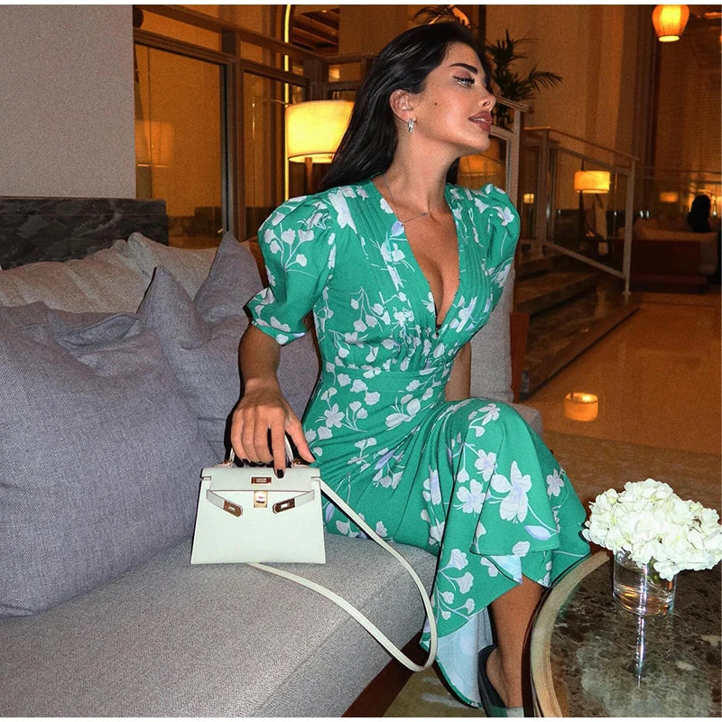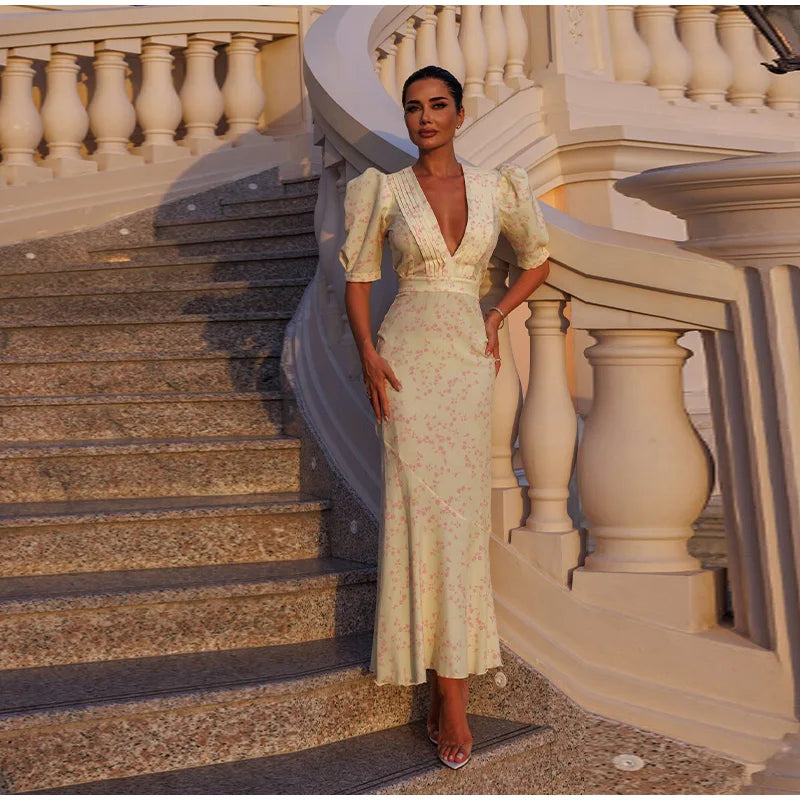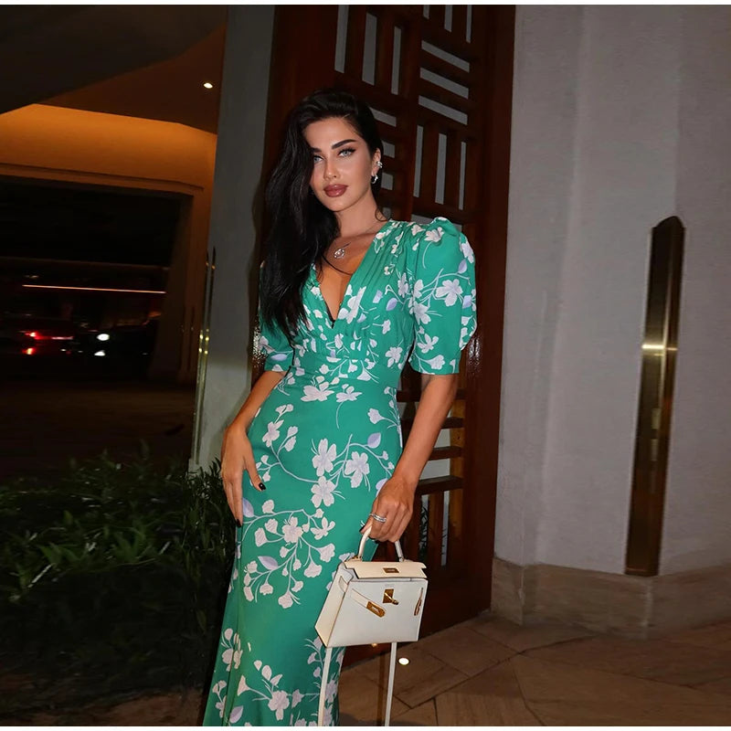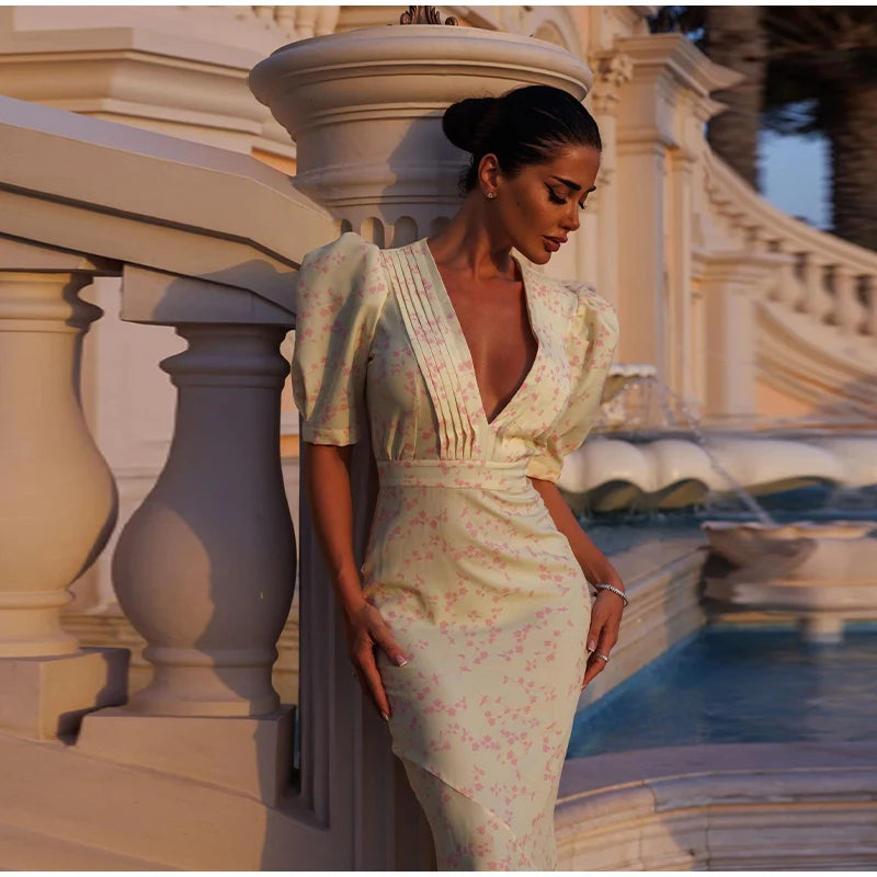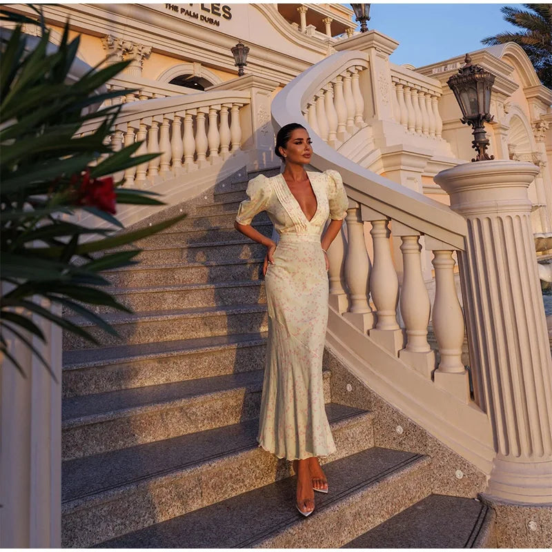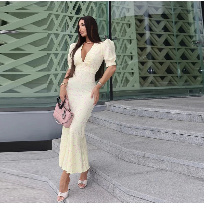 Experience unmatched exclusivity with this Printed Puff Sleeve Sexy Deep V-neck Dress High Waist Holiday Patchwork Chic High Waist Summer Dresses Party Lady Fishtail Robe, designed for women who desire elegance and standout style. This dress exemplifies refined taste and captures the essence of modern sophistication, making it a must-have for your exclusive wardrobe.