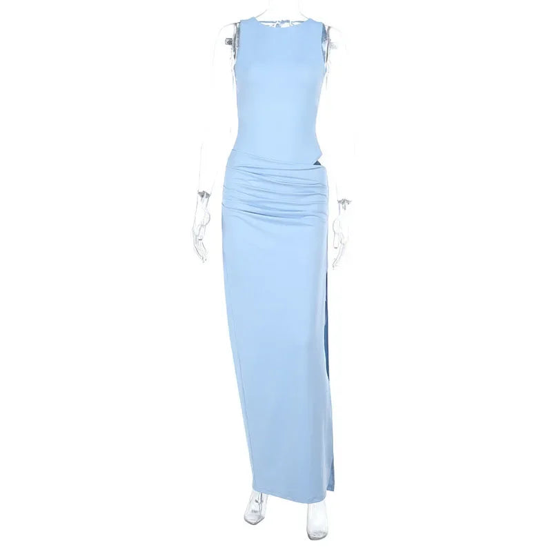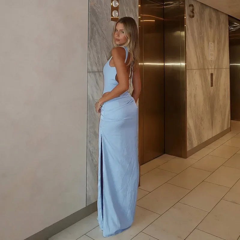 Experience unparalleled elegance with this exclusive Satin Hollow Out Women Long Dress Sleeveless Backless Waist Cinching Side Split Dress, designed for the stylish woman who values sophistication and refined charm. Crafted to captivate at any autumn evening party, this dress sets you apart with its unique combination of silhouette and detail.