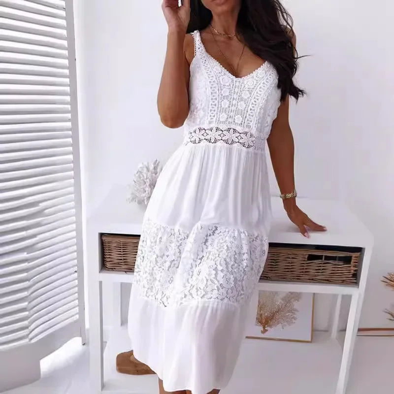 Made from premium, breathable materials, this dress offers luxurious softness against the skin, ensuring all-day comfort during warm weather outings. The exquisite hook flower hollow detailing adds a delicate touch that enhances its overall elegance.