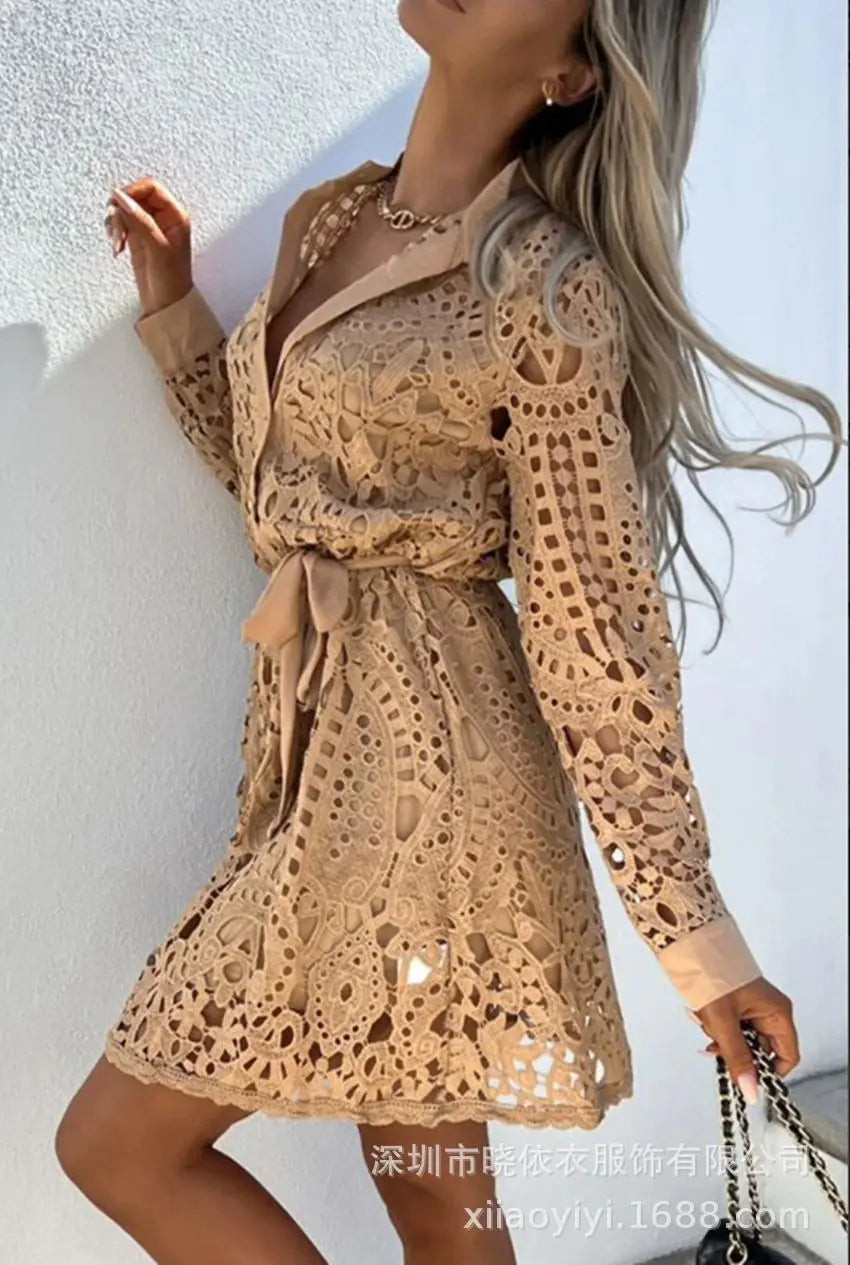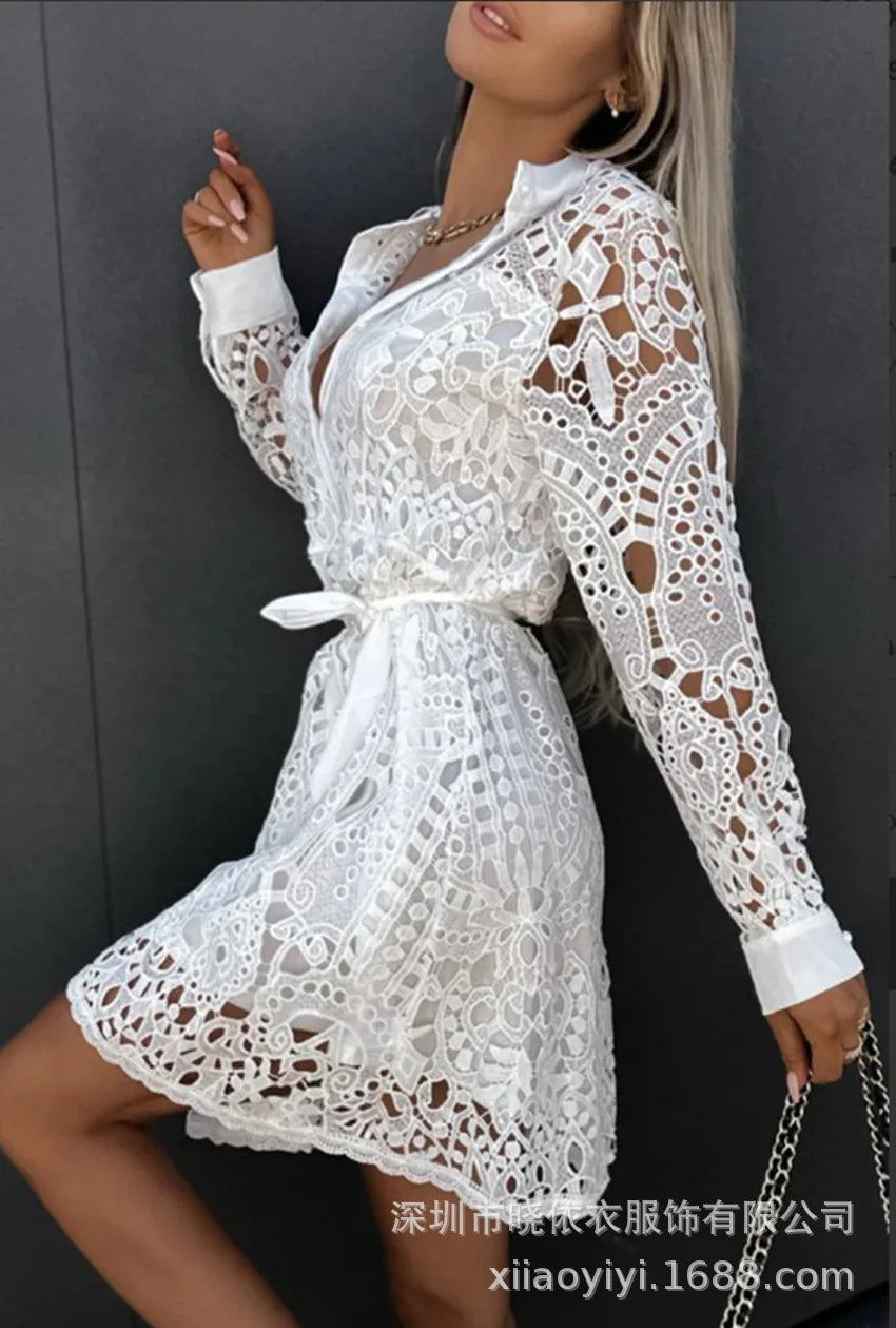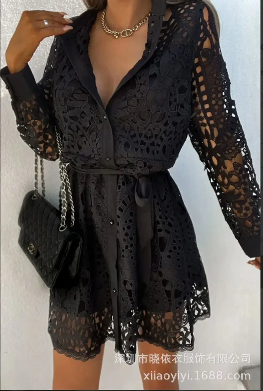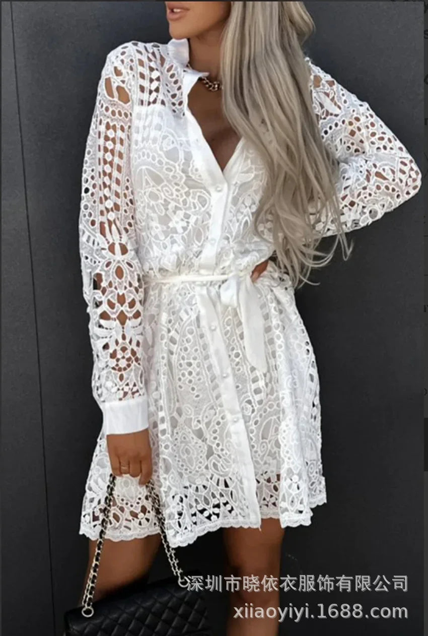 Elevate your seasonal wardrobe with this Women Shirt Dress Long Sleeve Tight Waist Belt Dresses Casual Lace Splice A Line Mini Vestidos Single Breasted Autumn 2024, where exclusivity meets exquisite design.