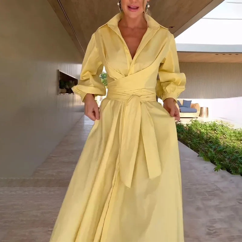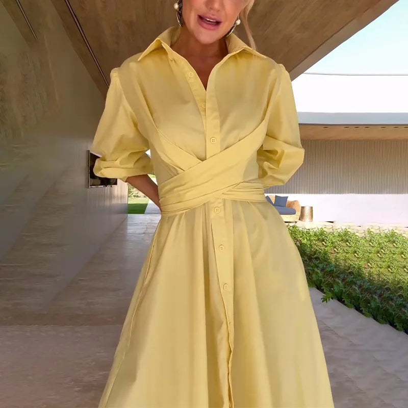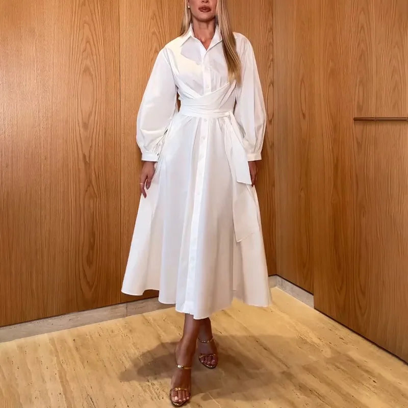 Crafted with meticulous attention to detail, the dress embodies heritage-inspired tailoring that honors classic shirt dress styles while embracing contemporary fashion trends. The elegant turn-down collar and single-breasted design highlight expert craftsmanship, making every stitch a testament to quality and style.
