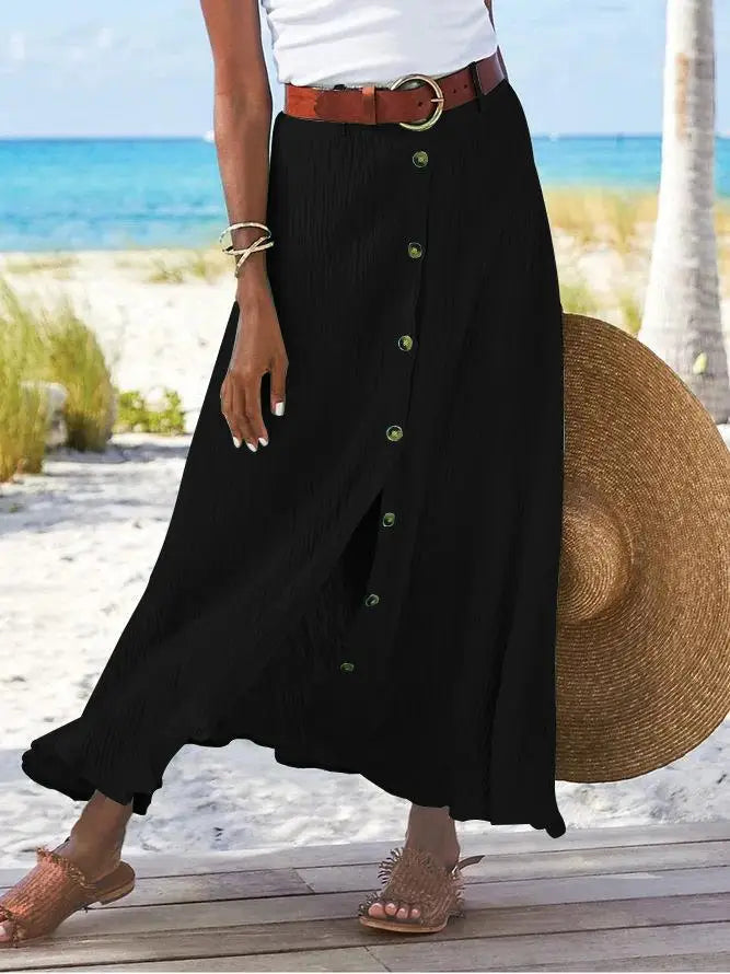 This edition stands out for its thoughtful details and superior craftsmanship. Featuring a sophisticated A-line cut, the skirt offers a flattering hip waist fit that complements a variety of body types. The button detailing adds a touch of classic flair, while the split design enhances mobility and breathability—ideal for spring and summer activities. Its loose, natural fit ensures comfort without sacrificing style, making it a versatile addition to your casual collection.