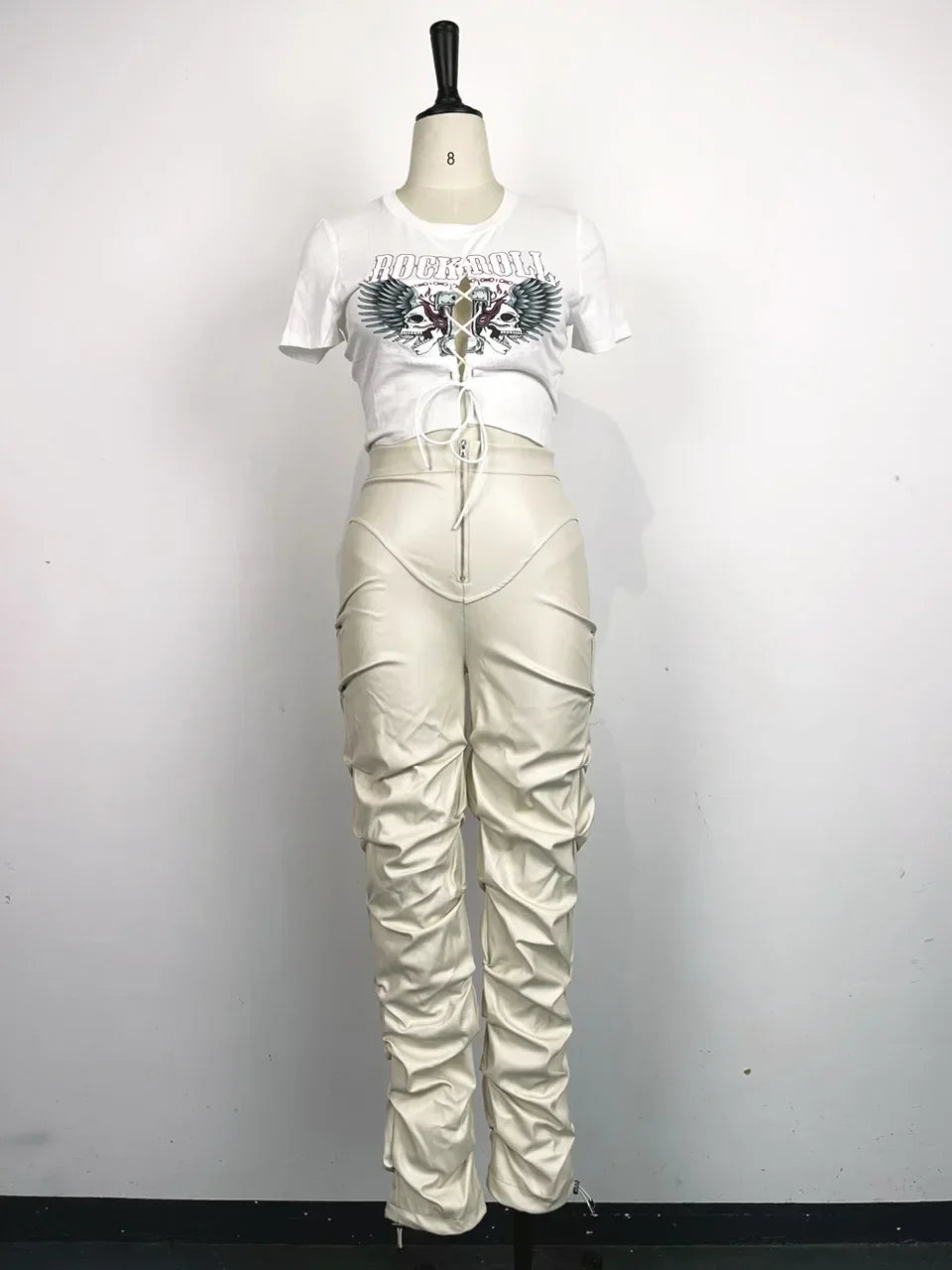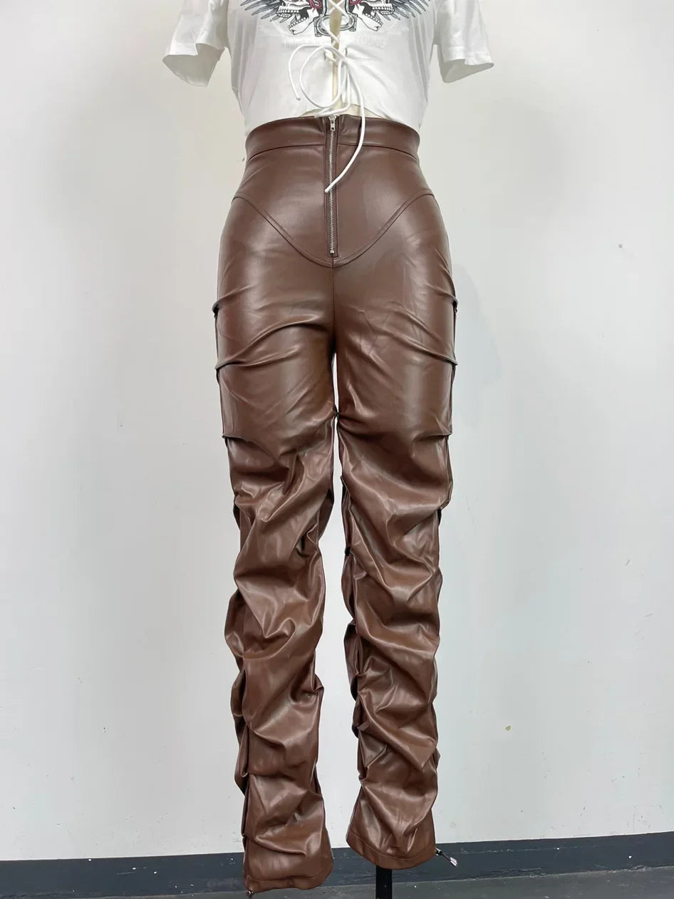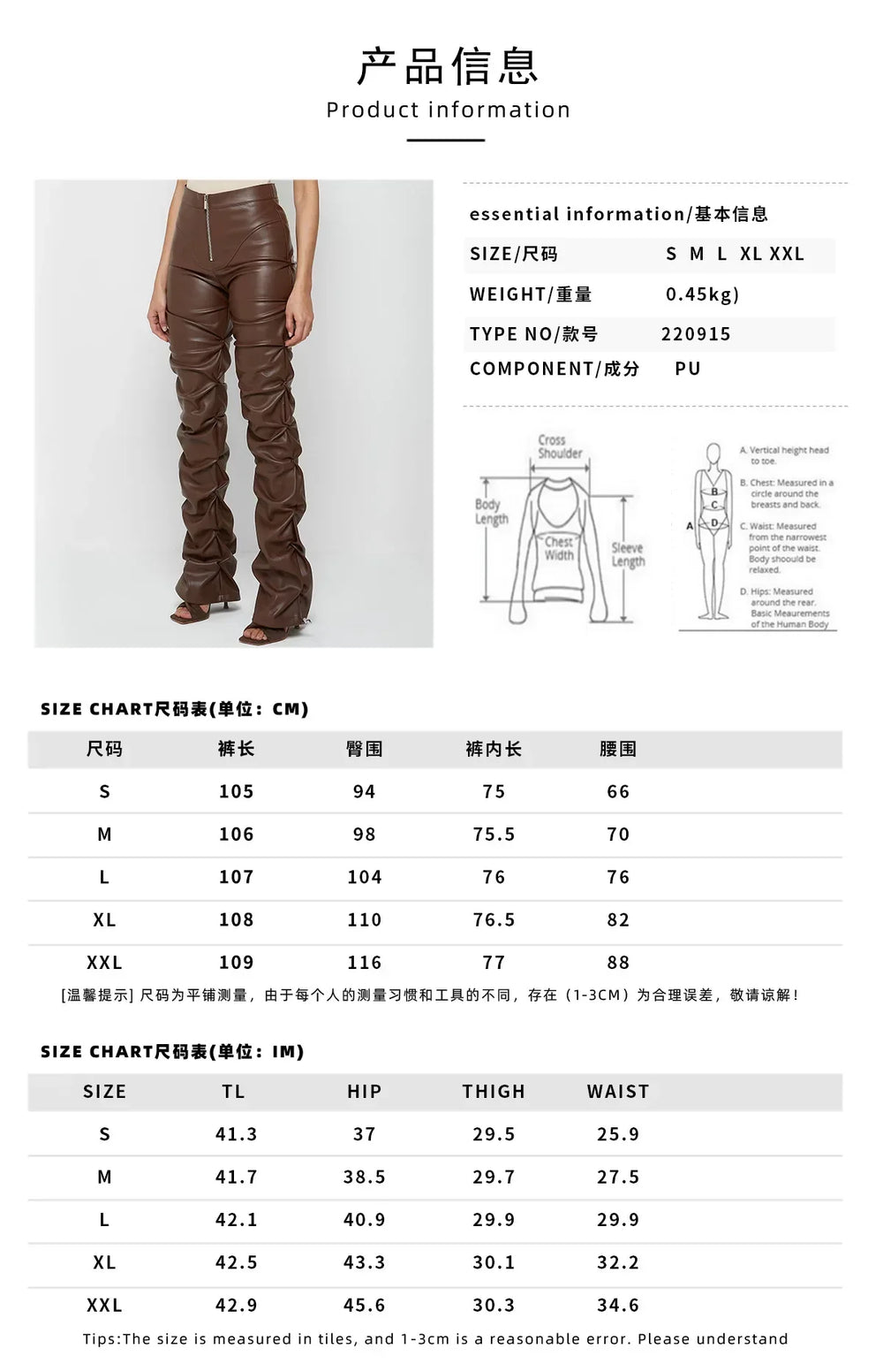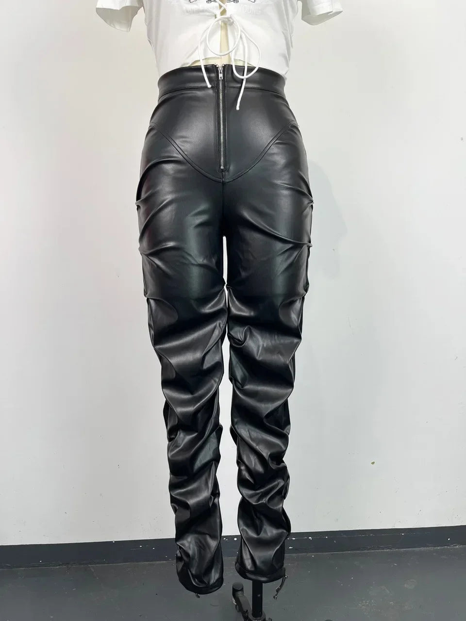 Constructed from premium polyester combined with high-grade PU leather, these pants offer a smooth, durable finish that feels as luxurious as it looks. The full-length design with a sleek zipper fly closure enhances both fit and aesthetic, making them a staple in any fashion-forward wardrobe.